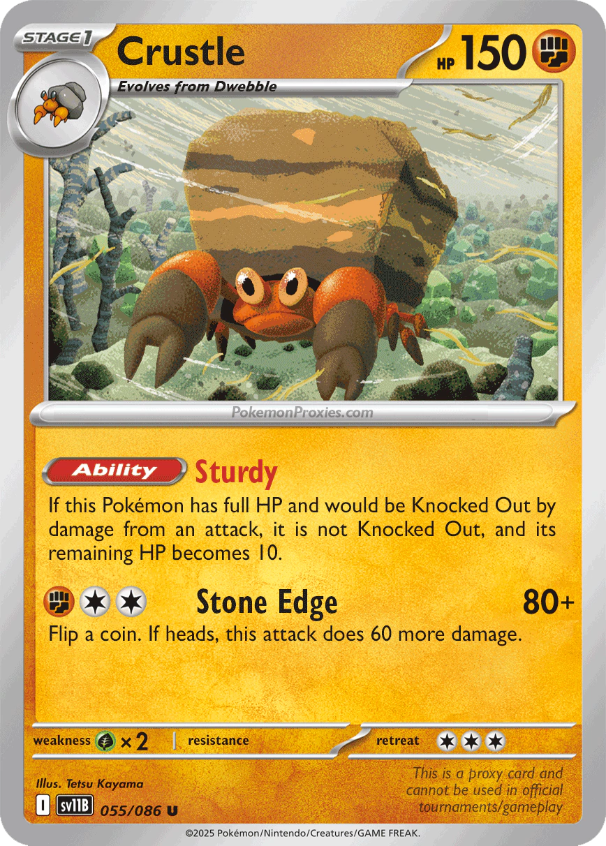 ¡Entrenador Pokémon! Si buscas fortalecer tu mazo o agregar una pieza especial a tu colección, en Pokestop.cl: Tu tienda online de cartas Pokémon encontrarás la carta Crustle (052/086) en INGLES. ¡Consíguela antes de que se agote!