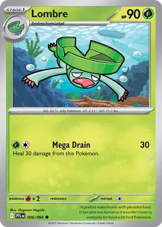 ¡Entrenador Pokémon! Si buscas fortalecer tu mazo o agregar una pieza especial a tu colección, en Pokestop.cl: Tu tienda online de cartas Pokémon encontrarás la carta Lombre (006/094). ¡Consíguela antes de que se agote!